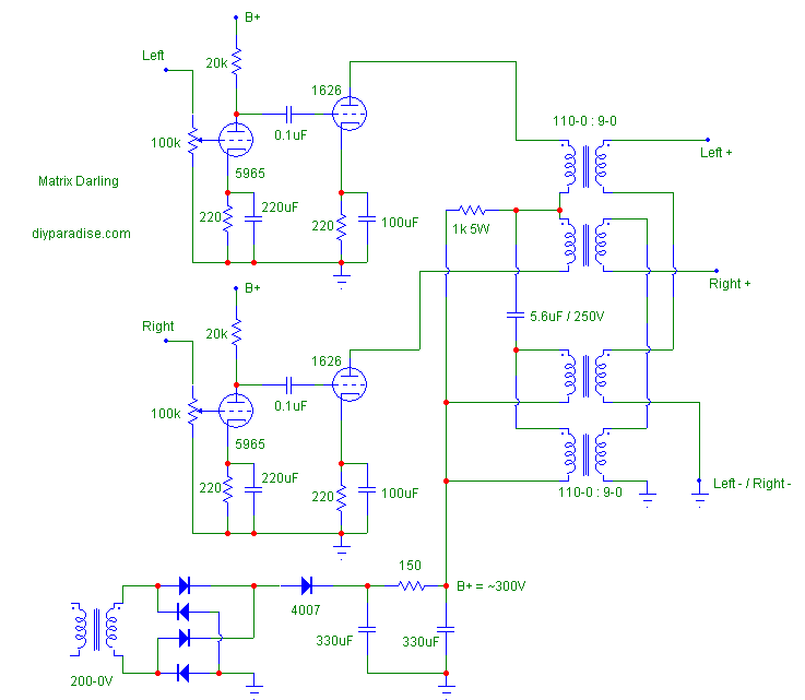 Unfortunately the above configuration has unbalanced DC current on the bottom trans. This is where parallel feed comes in. Steve used a ridiculously small 1.5H as parallel feed choke! But this doesn't matter to the Matrix topology as there's still plenty of bass. Due to size considerations, I can't fit in a choke (look at above pics). So I fitted in a 1kohm resistor. Works just as well. I can't fit in a big 30uF DC blocking cap too so 5.6uF it is. The output trans are actually ILP power trans with primaries of 110-0V, 110-0V and secondaries of 9-0V, 9-0V.
