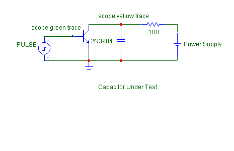 Have no fret! As DIY Paradise just completed a simple shootout between electrolytic capacitors. The target here is in the use in power supply decoupling. Test circuit as below. Pulse drives the base of the 2N3904 transistor and 2 points are monitored. The blue bubble labeled "scope green trace" and the red bubble labeled "scope yellow trace". If an ideal capacitor exists, then the capacitor under test will not show any ripple at all due to transistor switching on and off.