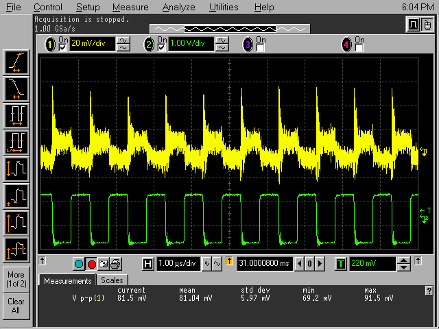 Generic "Max" electrolytic. 470uF 16V. Ripple of 81mV is measured.