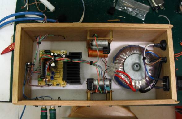 Liew's craftsmanship is evident here. Don't think I can ever build an amp so neat like this. From R-L: 200VA trans, +30VDC and -30VDC supplies and the AMP1. Chassis is a tissue box made from Malaysian rubber wood. My pathetic attempt to be patriotic...